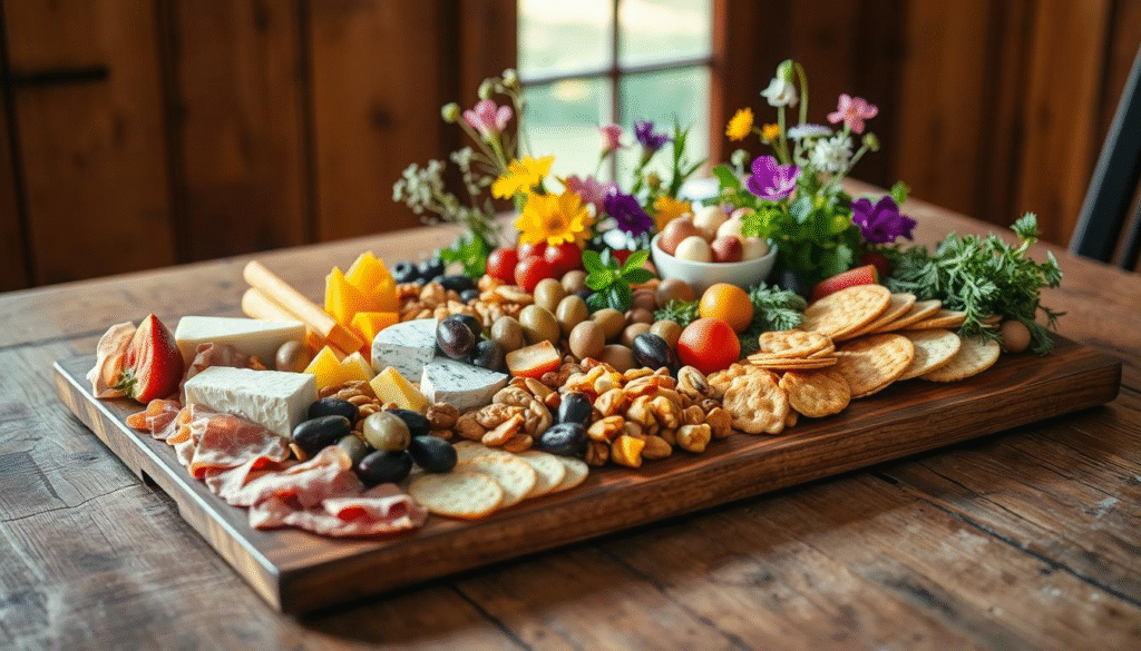 Rustic themes create a cozy, inviting vibe. Use natural materials like wooden boards, slate, or marble. Add fresh herbs, artisanal cheeses, and cured meats for taste and looks.